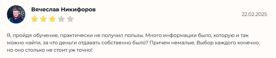Все пользователи считают обучение специалиста пустым. Один из юзеров даже сообщает, что во время общения пытался объяснить, что аналитик не прав, но его никто не стал слушать. По итогу человек потратил деньги на бесполезную, поверхностную информацию.
