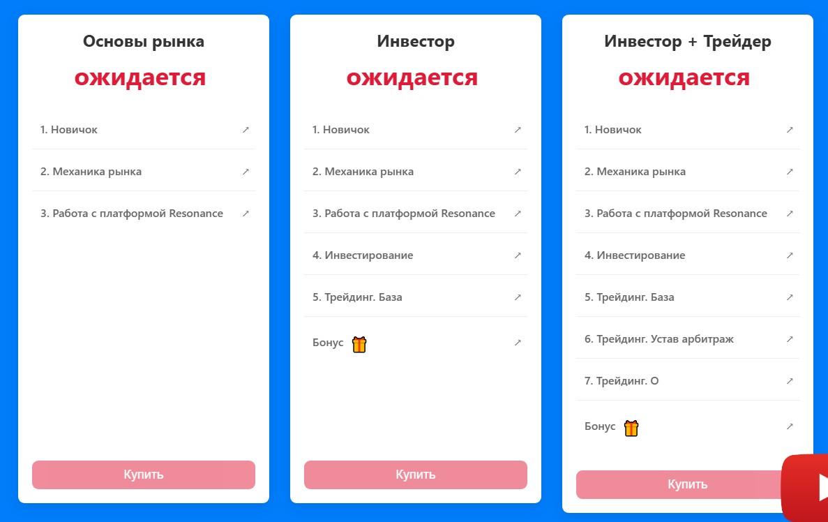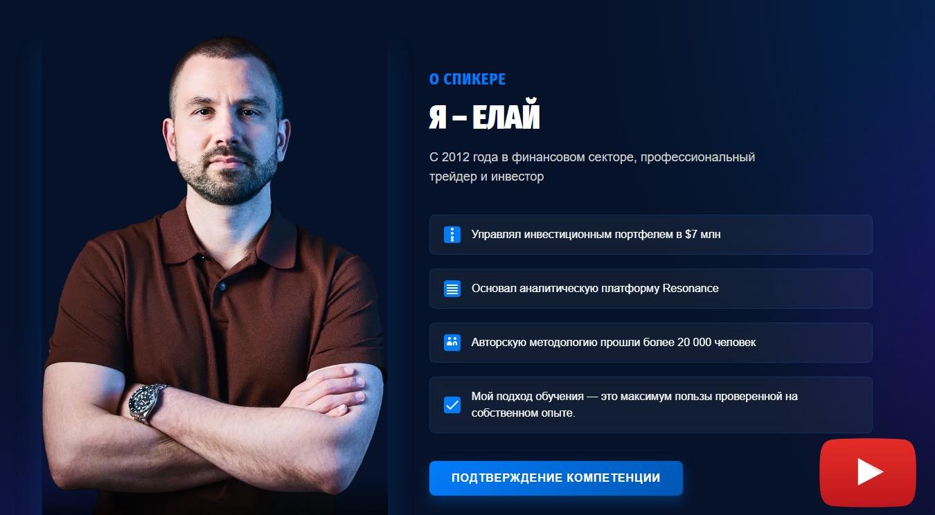 Стоимость нового курса пока не указана. Написано, что ценник ожидается. Поэтому кнопка «Купить» тоже не работает.Куратор обоих курсов и основатель «Резонанс» – Елай. На сайте написано, что он с 2012 года занимается трейдингом и инвестициями. Имеет опыт управления инвестиционным портфелем размером 7 000 000 долларов. Обучение у него прошли свыше 20 000 человек. Уверяет, что вкладывает в программу курсов только свой уникальный опыт.