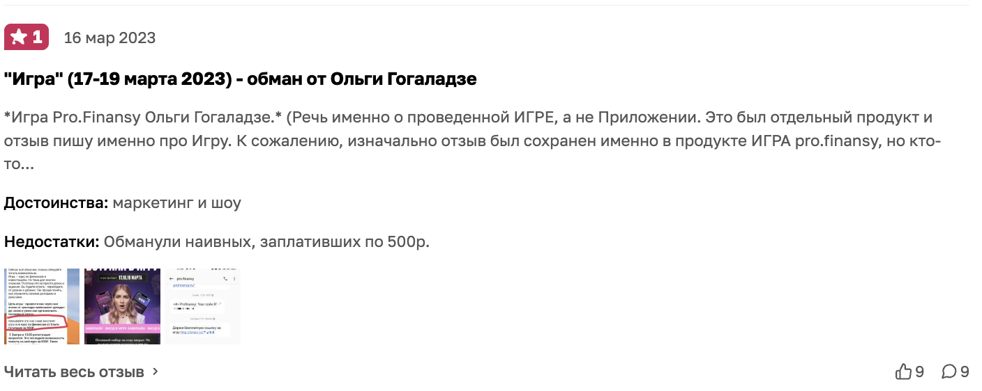 На просторе интернета можно найти множество отзывов о Profinansy ru. Однако такое большое количество комментариев не говорит о том, что все реальные отзывы об Ольге Гогаладзе хорошие. Множество негатива со стороны участников курса. В своих отзывах об инфопродукте от Ольги Гогаладзе пользователи жалуются, что заявленные функции дают мало практической ценности и не дотягивают до обещаний. Некоторые даже отмечают, что единственным полезным поинтом курсов являются распечатки за 3000 рублей и не более. Ожидаемого результата участники тоже не дождались.