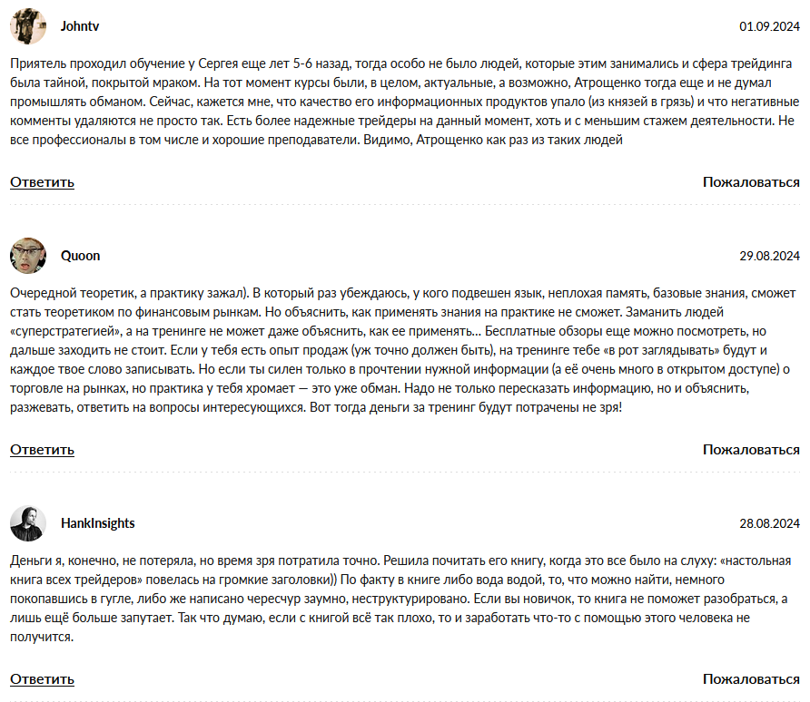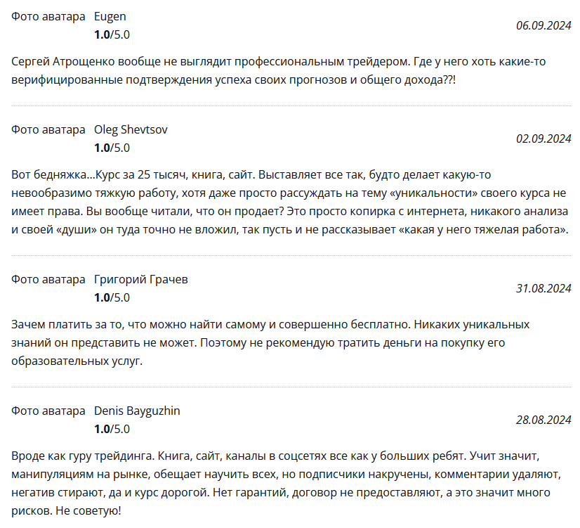 В завершение обзора предлагаем еще раз «пройтись» по всем обнаруженным фактам, но уже тезисно и поделив их на объективно сильные и слабые стороны. Далее вы можете ознакомиться с общей картиной и решить — учиться ли у Атрощенко или не стоит тратить на это время.