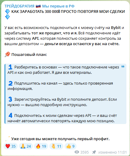 В своем ТГ-канале «Трейдобратия» Евгений Баженов постит автоскрины с биржи Bybit с ракетой, показывая якобы успешные сделки. Однако никогда не фотографирует свой торговый терминал, поэтому сказать, правда ли он такой успешный или нет — нельзя. Несмотря на то, что на проект подписаны 14,5 тыс. человек, охват аудитории низкий — посты набирают всего по 3–4 тыс. просмотров.