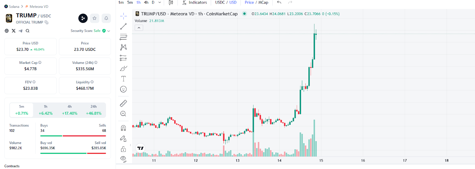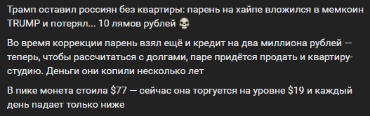 Трамп коин популярен на волне хайпа и политической активности. Вложение в такие монеты требует внимательности, понимания рисков и готовности к высокой волатильности. Многие трейдеры уже потеряли огромные вложения на фоне упадка монеты.
