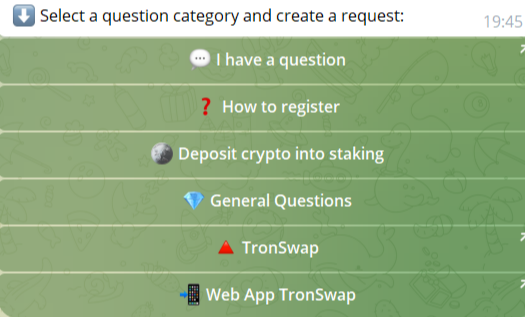 TronSwap Support – tronswapsup bot, сервис службы поддержки компании, отвечающий на часто задаваемые вопросы пользователей.
