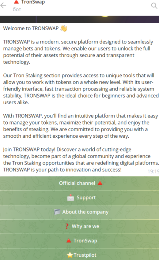 Компания имеет 2 бота. Основной бот в телеграмме – tronswapltd bot отображает информацию о компании, регистрации, ссылки на канал, техподдержку и отзывы.