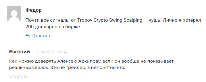 Отзывы о проекте Tropov Crypto Swing Scalping и его владельце Алексее Архипове