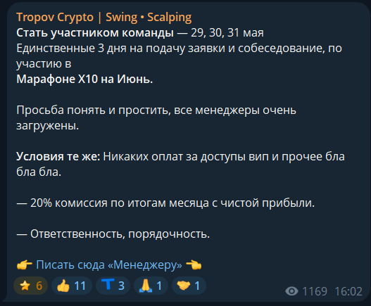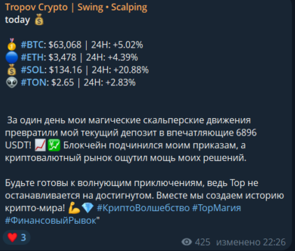 Мы изучили всю доступную информацию о телеграм-канале Tropov Crypto Swing Scalping и пришли к выводу, что перед нами очередной скам-проект. На это указывают сразу несколько признаков: