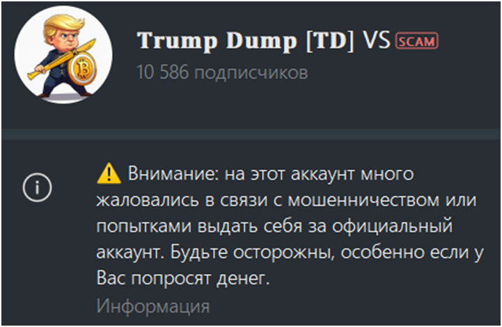 Еще меньше доверия к трейдеру и его проекту появляется при открытии его тг-канала Trump Dump – первое, что бросается в глаза – красная пометка о скаме, которая должна заставить пользователей отказаться от желания вступить в проект.