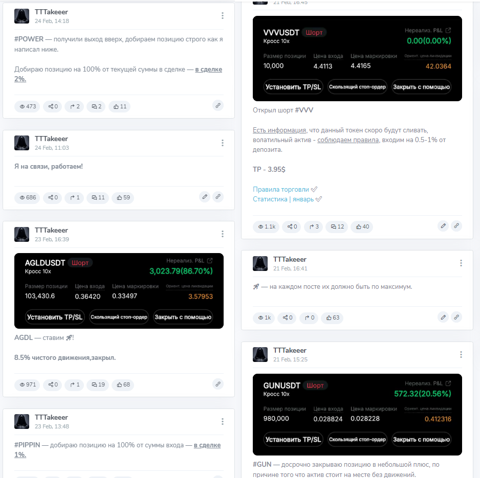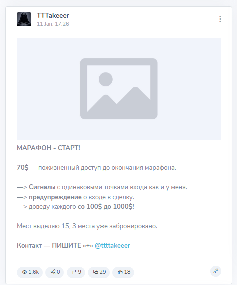 С первого дня блогер начал заманивать аудиторию торговать по его методу. Он просит поставить подписчиков плюс в комментарии, кто начал работать. Только видно, что комментарии под постами закрыты.В блоге «Тттейкер» нет полезных бесплатных базовых материалов, которые могли бы зрителям помочь самостоятельно начать зарабатывать на бирже и инвестиционных сделках. Автор публикует только объявления о том, он открыл или закрыл позицию. Работает он всегда с различными криптовалютами.
