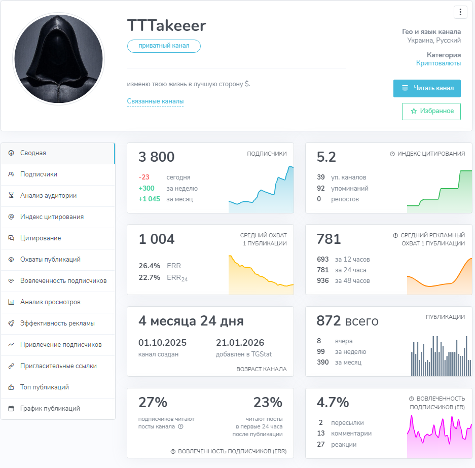 В реестре TGStat нам все же удалось найти этот канал. Здесь указывается, что проект TTTakeeer действительно является приватным и создан он на Украине. Существенного описания у канала нет, поэтому непонятно, в чем его миссия, что здесь будет и кто стоит за его кадром.