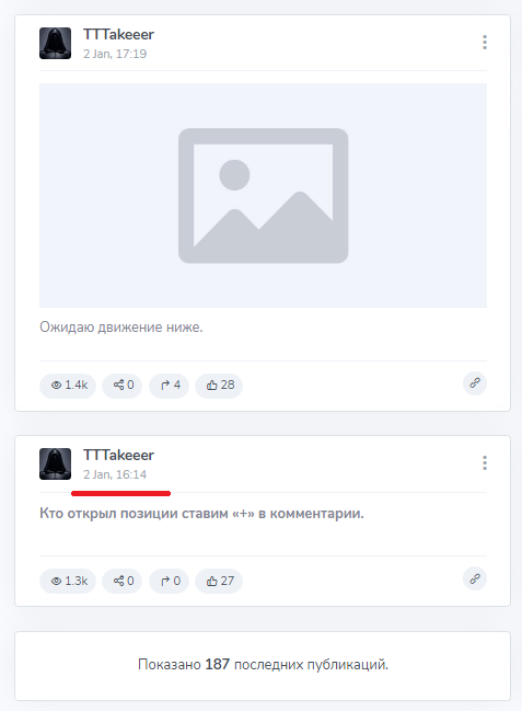 С самого начала его контент начали просматривать более тысячи и людей, но лайки ставят всего 26-28 человек. Скорее всего, это тоже накрученные показатели, как и аудитория. Видно, что настоящим трейдерам выходящие тут публикации не интересны.