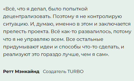 Согласно заявлению Мэнкайнда, он уже не контролирует криптовалюту «Турбо». Получается, что разработчики крипты Turbo не способны обеспечить ее развитие, а курс «Турбо», скорее всего, определяется исключительно рынком на основе баланса спроса и предложения.