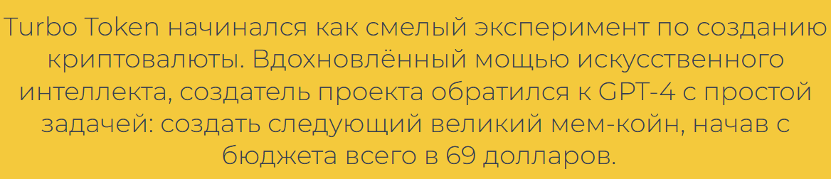 Автор проекта Turbo Token Ретт Мэнкайнд не скрывает того, что это «мем», не имеющий никакой внутренней ценности. На официальном сайте Turbotoken IO есть информация об «истории» данного токена. Создатель крипты «Турбо» рассказывает, что он обратился к искусственному интеллекту GPT-4, попросив «изобрести великий мемкоин при бюджете в $69». То есть, в основе данной монеты лежит шутка.