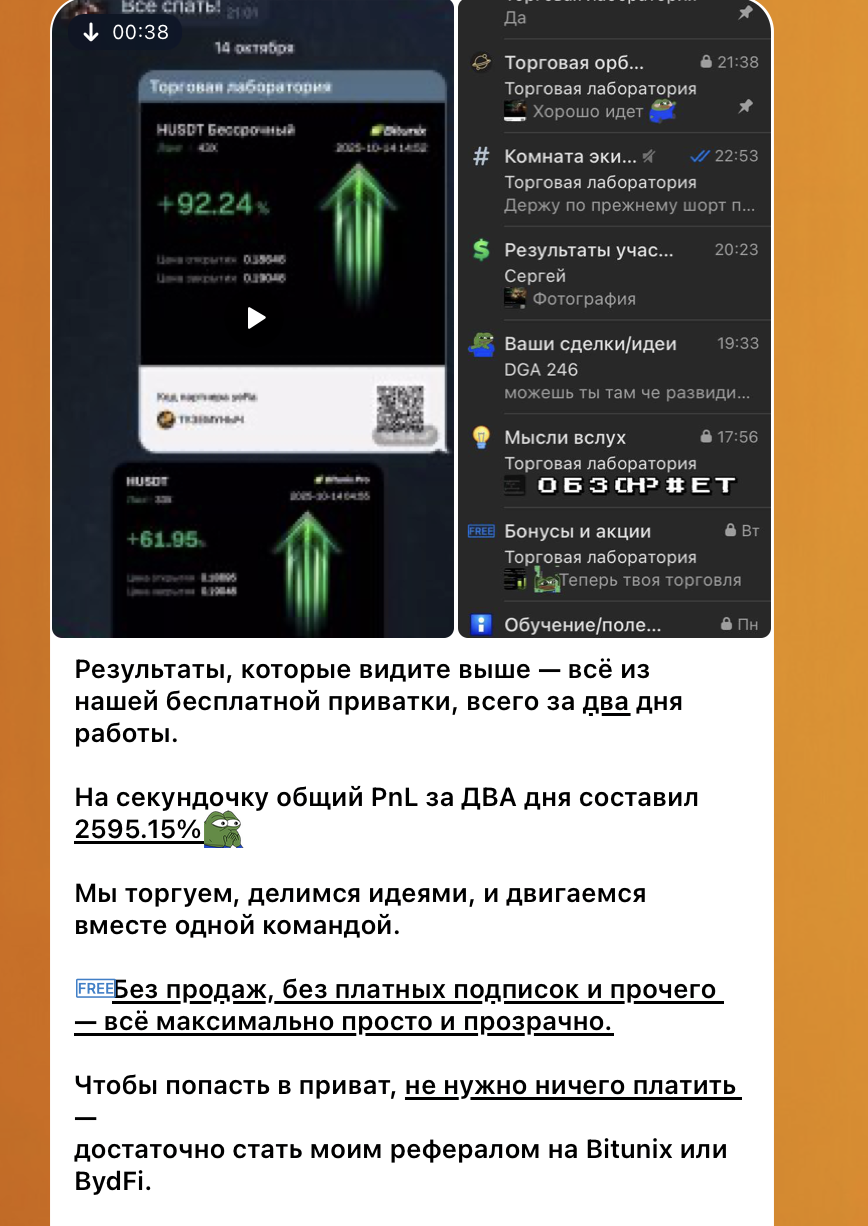 Визуально канал оформлен ярко: брендированные изображение, графики, скрины из платформ BingX и Bitunix с процентами прибыли, порой превышающими +1000%. Такие цифры сразу притягивают внимание, особенно у тех, кто ищет быстрые результаты на рынке. При этом автор не раскрывает деталей сделок, объемов входа или уровня риска — только финальные проценты, что уже вызывает сомнения.