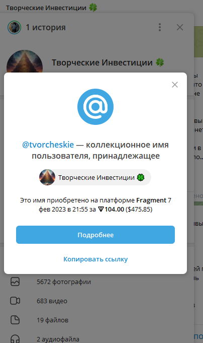 Юзернейм канала — tvorcheskie, является коллекционным именем, выкупленным в феврале 2023 года.