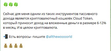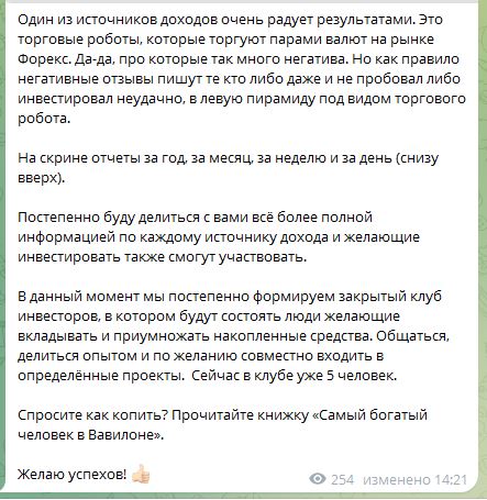 Очень аккуратно, ненавязчиво проходит информация о торговых роботах и проектах, в которых участвует автор. Правда, часть сообщений именно с таким содержанием удалено. Есть намеки на формирование закрытого инвестиционного клуба, но явных приглашений в него нет.