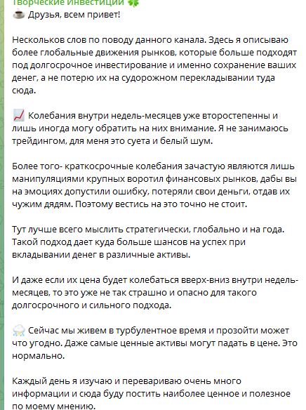 Канал Творческие инвестиции появился в телеграмм в июле 2019 года. Первые несколько публикаций были рассуждениями о долгосрочных перспективах рынка криптовалюты в условиях сиюминутного падения. И спустя несколько недель появилось объяснение цели и назначения канала.