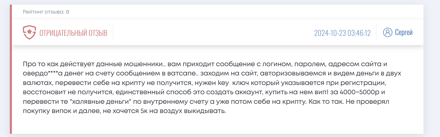 Другой момент: домен зарегистрирован в сентябре 2024 года. Новые сайты часто создают мошенники, которые пытаются уйти от отрицательной репутации. Скам uebeo com не стал исключением.Сразу после регистрации клиенту предлагают перечислить криптовалюту на кошелек. При этом в блокчейне не создается новый кошелек, для каждого отдельного клиента. Владельцы ресурса каждому человеку дают один и тот же адрес.