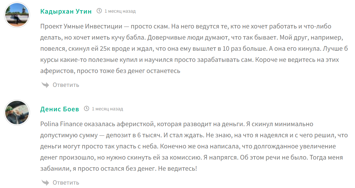 Проект “Умные инвестиции” отзывы собрал различные. Большинство из них говорят о том, что деятельность трейдера нужно тщательно проанализировать, прежде, чем с ним сотрудничать. Полина, автор сообщества, предлагает внести депозит на ее счет, чтобы в течение нескольких часов получить 10-кратную прибыль.