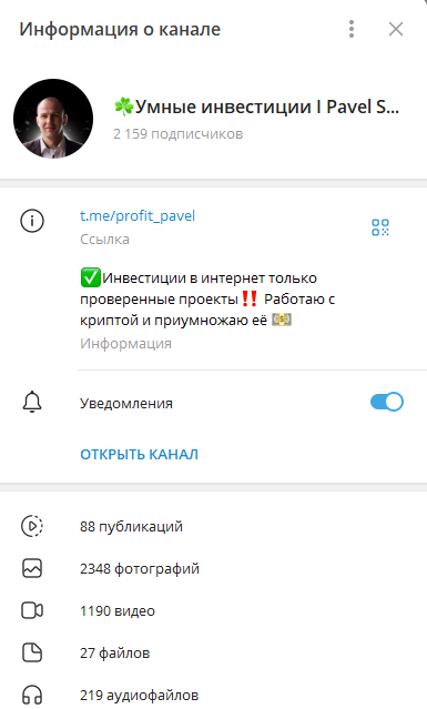 Умные Инвестиции Павел Щеглов – это канал в Телеграме, который посвящен заработку на криптовалютах. Владелец канала активно продвигает инвестиционные проекты и предлагает закрытый чат с торговыми сигналами. Мы не смогли проверить квалификацию трейдера в открытых источниках, поскольку он не работает нигде, кроме своих каналов. Кроме паблика в Телеграме Profit Pavel, у аналитика есть каналы в Инстаграме Pavel Shcheglow и Ютубе Tetavell. Связь с Щегловым происходит через ЛС @Tetavel81.