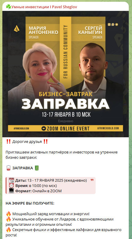 Автор проекта Умные инвестиции Pavel Sheglov акцентирует внимание на современных трендах в инвестициях, таких как криптовалюты, блокчейн и токенизация активов. Подписчикам предлагаются образовательные мероприятия, например, онлайн-бизнес-завтраки. На них приглашенные спикеры делятся опытом в сфере управления финансами и инвестирования.