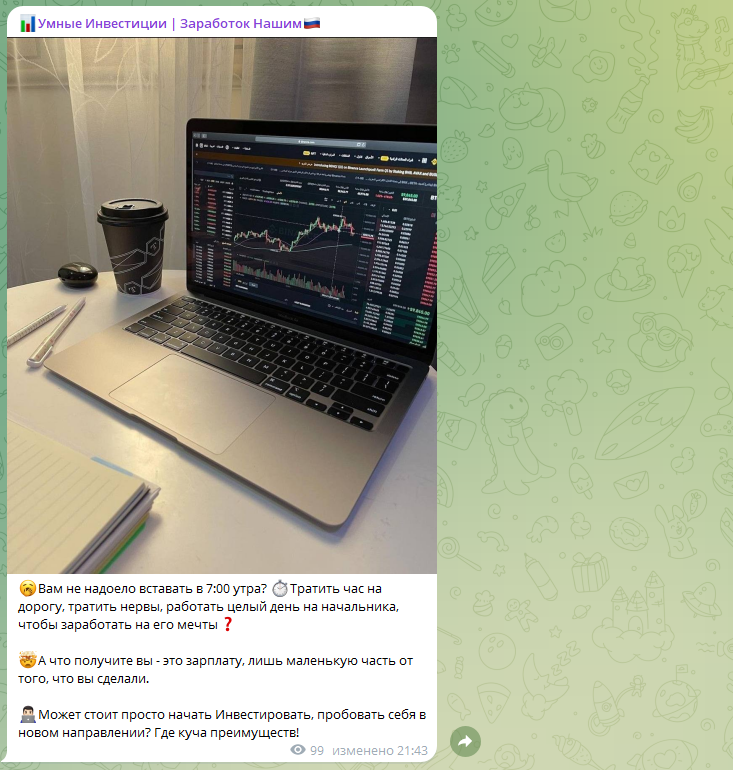 Образ сыпется, когда смотришь за активностью на канале. Успешный трейдер, который зарабатывает десятки тысяч долларов, не может купить рекламу. Приходится накручивать подписчиков и создавать иллюзию активности.