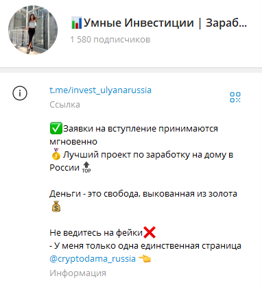 Умные Инвестиции с Ульяной — это классическая раскрутка счета. Пользователям предлагают вложиться в ее проект, чтобы заработать от х50 к первоначальному депозиту.