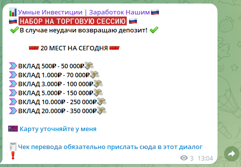 Каждый день выходят посты с призывами поучаствовать в торговой сессии. Количество мест ограничено. Обычно это 20 человек, которые могут вложить от 500 рублей.Доход неадекватный. Ульяна говорит, что за одну сессию может стабильно зарабатывать от х100 к первоначальному депозиту. Это откровенный обман. Не существует роботов, которые могут стабильно и каждый день выдавать подобные результаты. Даже лучшие трейдеры в истории не зарабатывают такие большие деньги.