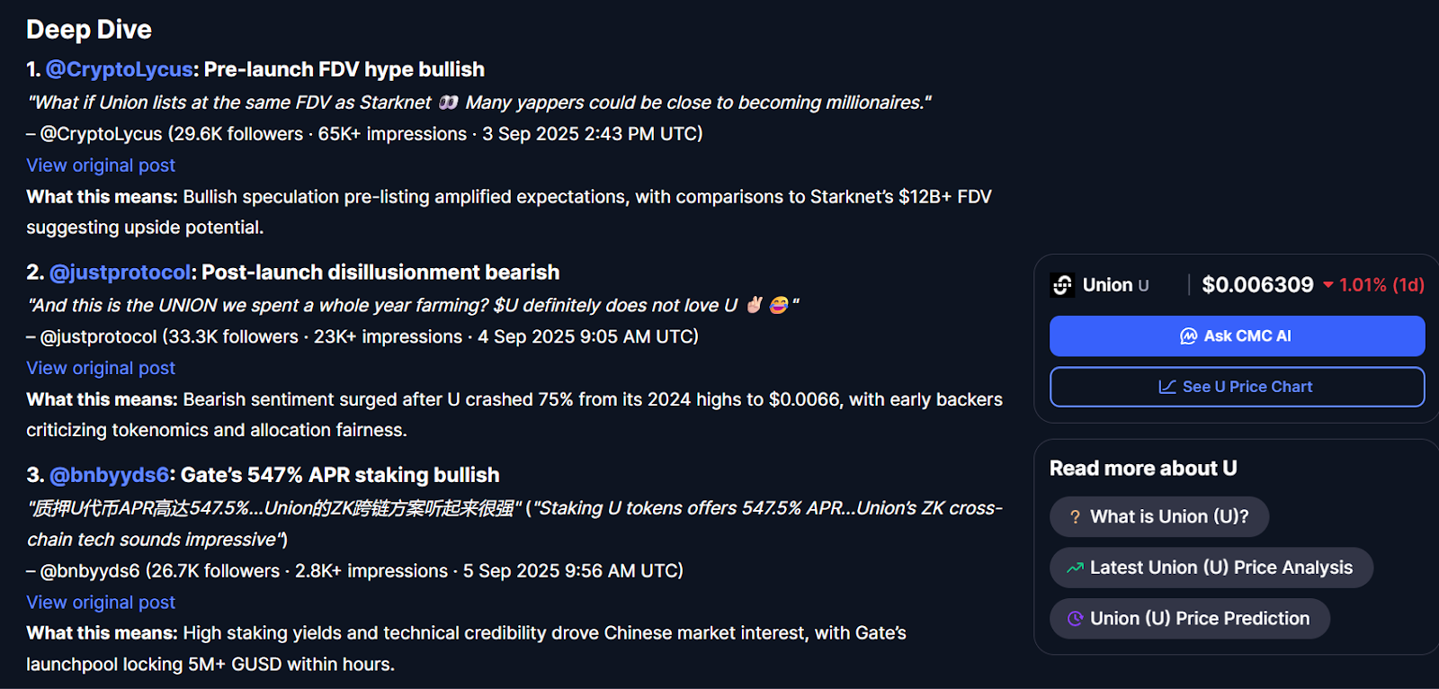 Токен U от Union является сформированным и технологически проработанным активом. У него присутствует многофункциональное назначение. Некоторые отмечают потенциал, но специалисты рекомендуют учитывать риски. Проект просуществовал около двух месяцев, поэтому пока рано еще отмечать точные прогнозы. Трейдеры приходят к мнению, что пока слишком много рисков для долгосрочных инвестиций.