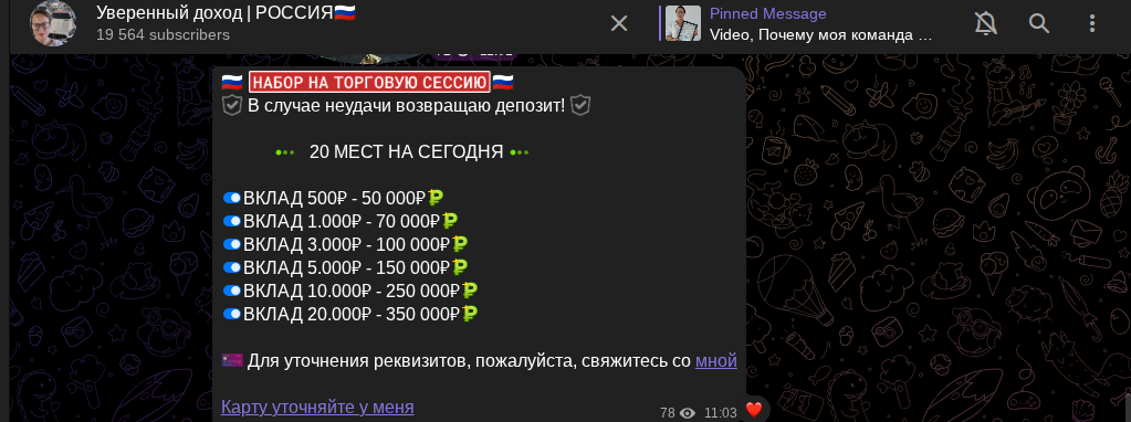 Автор проекта анонсирует ограниченное количество мест, например, 20 на работу. Далее, кому повезло, должен сделать депозит. Стоит отметить, что каждый отписавшийся становится участником, а ограничение лишь для побуждения интереса. Варианты вложений в ТГ «Уверенный доход Россия»:
