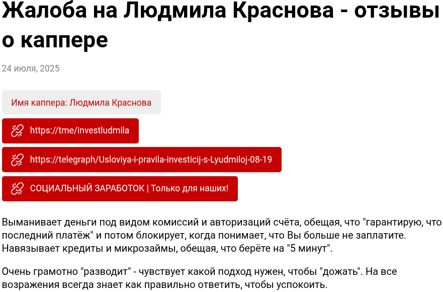 • Отрицательные отзывы об инвесторе, где подписчики телеграмм-канала трейдера «Уверенный доход Россия» Людмилы Красновой называют ТГ разводом.