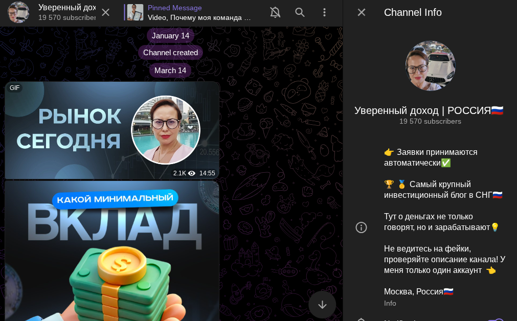Более того, эксперт не обращает внимание на отсутствие отчетности и продолжает «греть» пользователей обещаниями прибыли. Чтобы подписчики больше доверяли, реальный автор сообщества использует фотографии и видео женщины, надеясь, на наивность участников проекта. В описании телеграм-канала «Уверенный Доход Россия» трейдер Людмила Краснова пишет про тотальную успешность.