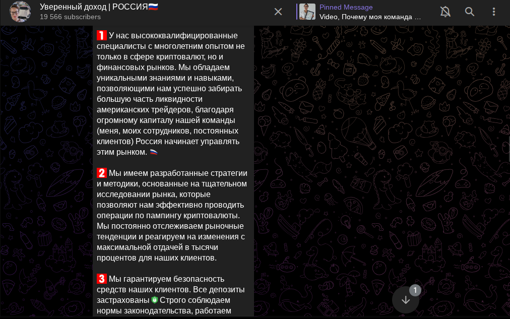 По легенде эксперты телеграмм-канала трейдера «Уверенный доход Россия» Людмилы Красновой занимаются пампом, т.е. искусственным раздутием стоимости токенов, чтобы «сбрить» ликвидность. Однако команда хочет помощь соотечественникам в повышении материального положения, а потому предлагает стать долевыми участниками.