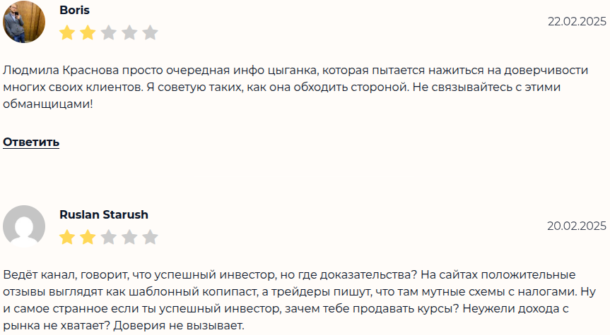 О деятеле есть как положительные, так и отрицательные фидбеки. В отрицательных отзывах об инвесторе пользователи телеграмм-канала трейдера «Уверенный доход Россия» Людмилы Красновой пишут, что это ТГ развод.