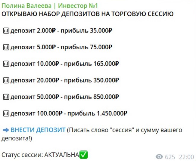 Валеева Полина — трейдер из Телеграма, предлагала подписчикам раскрутку депозитов. Якобы зарабатывала на пампах криптовалют с небольшой капитализацией, гарантировала, что получить с ней убытки невозможно, а клиента ждет только огромная прибыль.