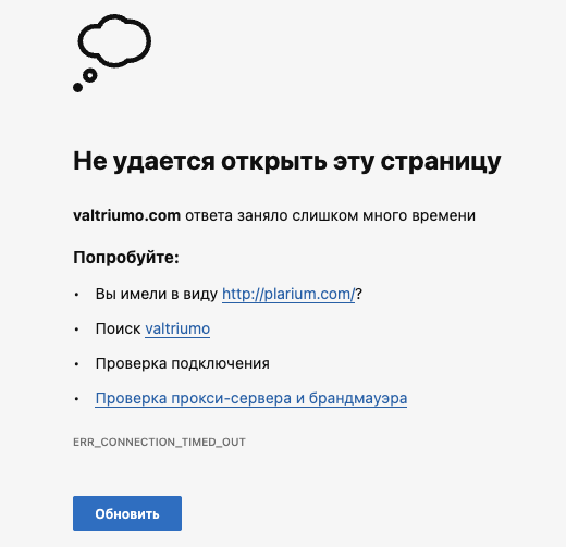 На 20 декабря 2025-го года сайт биржи «Валтриумо» не открывается. О нем нет информации в интернете, а снимки данного ресурса отсутствуют в «Веб-архиве».