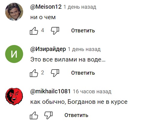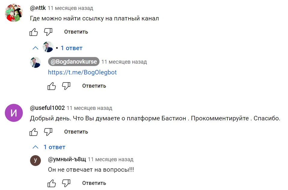 На тематических форумах отзывов об Олеге Богданове нет, ни положительных, ни отрицательных. Но можно оценить комментарии под видео в YouTube. Здесь встречаются различные отклики и замечания. Немало людей пишут о том, что его обзоры ни о чем. Также обращают внимание на то, что на вопросы пользователей он не отвечает. Только, если касательно сотрудничества, он просто дает ссылку на бот.