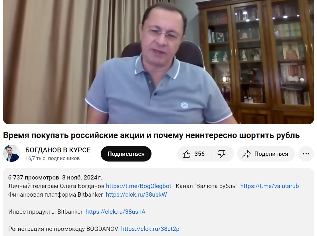 На этом ресурсе трейдер публикует ссылки на личный аккаунт — Oleg Bogdanov @ bogdanovkurse, на бот для подписки на закрытый канал с сигналами и аналитикой — bogdanovkurse @ BogOlegbot и на открытый канал в Телеграм. Кроме этого, он призывает подписаться на биржевую платформу Bitbanker, которая в сети имеет не однозначную репутацию, по его реферальному коду. Стоимость подписки на платный канал и условия сотрудничества нигде не указаны. Очевидно, что главным таким условием является подписка на торговую платформу Bitbanker.На канале в Телеграмм Олег Богданов публикует экономические показатели различных стран, новости рынка, ссылки на свои видео, опубликованные в Ютуб, и рекламу сомнительных проектов. Только третья часть подписчиков просматривает выложенные посты, реакции оставляют единицы. Комментарии не доступны.