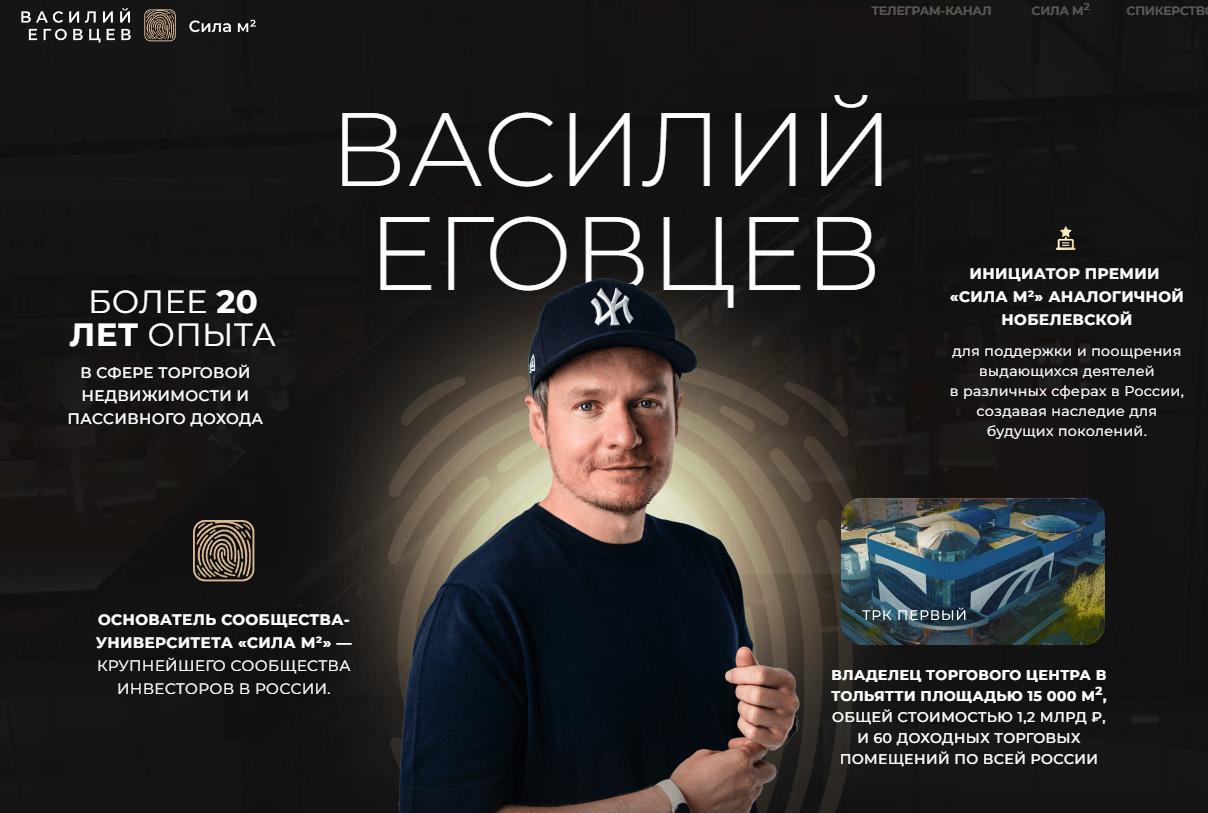 Василий Еговцев – это предприниматель и инвестор с более чем 20-летним опытом в сфере торговой недвижимости и пассивного дохода. По легенде он является владельцем крупного торгового центра в Тольятти площадью 15 000 м². Его стоимость – 1,2 млрд рублей. А еще он якобы владелец 60 доходных торговых помещений по всей России. Василий основал сообщество «Сила м²» — крупнейшую платформу для инвесторов в России.