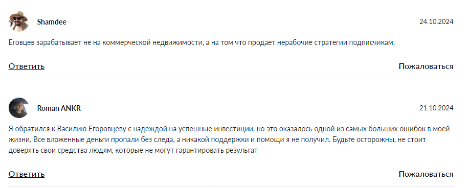 Оценка объективности отзывов о инвесторе Василии Еговцеве