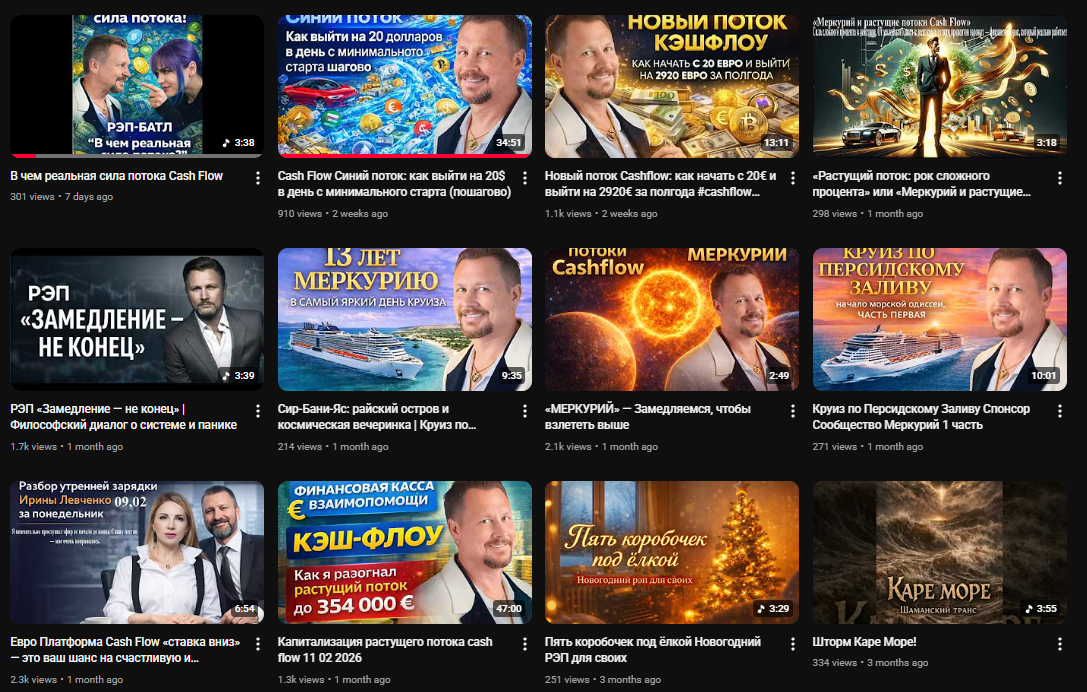 На Ютуб Василий Гурченко публикует видео об инвестициях в сомнительный проект Кэш Флоу. Эта компания по своему устройству напоминает финансовую пирамиду. Данный сервис работает без лицензии от Центрального Банка РФ, из-за чего сотрудничество с ним опасно.Платных или бесплатных услуг Василий не предоставляет. По сути его канал нужен для рекламы инвестиционных проектов, которые обещают высокий заработок с минимальными вложениями. Блогер обещает, что заработает каждый. В качестве доказательства он демонстрирует свою богатую жизнь: отдых на круизном лайнере, поездки в Арабские Эмираты и другие недешевые события.