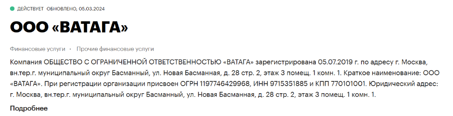Организация ООО “Ватага” найдена в реестре юридических лиц Московского региона. Дата основания компании – 2019 год, а уставный капитал 100 тысяч рублей.