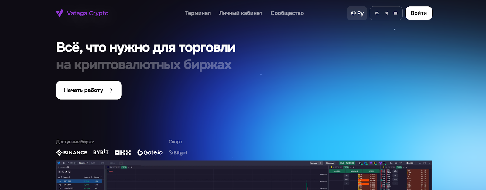 Терминал можно скачать на свой персональный компьютер, при этом он совместим с ведущими международными криптобиржами Binance Bybit, BitGet и т. д.