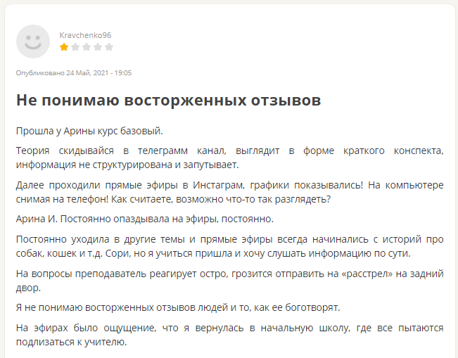 Учащаяся по имени Ирина Васильевна также оставила негативный комментарий, в котором она называла курсы Арины разводом на деньги