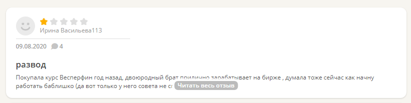 Так как вебинар Vesperfin Code вышел недавно, отзывов о нем пока нет. Вместо них мы проанализировали мнения учащихся о школе Арины, оставленные на сайте iRecommend. Студентка под ником Kravchenko96 написала негативный комментарий, в котором выразила сомнение в профессионализме Веспер и раскритиковала качество ее курсов.