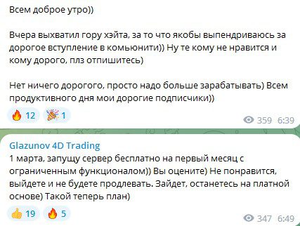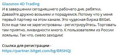 На платном канале он обещает еще больший объем аналитики, обзоров, торговых идей (сигналов). Два раза в неделю он планирует проводить обучающие стримы и приглашать интересных людей.Кроме платных услуг сравнительно недавно на ресурсе стали появляться публикации с призывами подписаться на биржу Bitget. Очевидно, что это только начало, следом за этим появятся, по стандартному алгоритму развода, и другие инвестиционные проекты сомнительного характера, от партнерства с которыми мошенник Виктор Глазунов будет зарабатывать на своих рефералах.