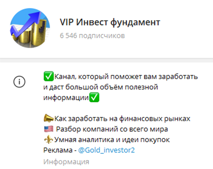 “Vip инвест ученик” telegram проект, который носит информационный характер. В чате делается детальный обзор акций отечественных и иностранных компаний. В описании проекта сказано, что подписка на данный канал поможет лучше разбираться в инвестициях.