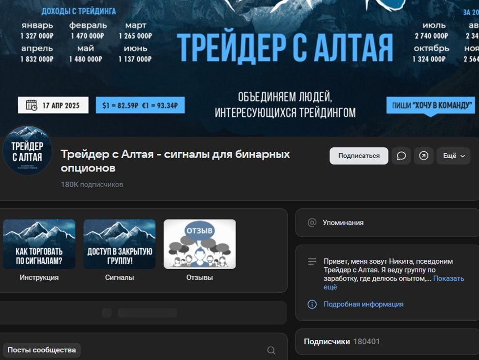 У трейдера много разных групп в соцсетях. В тг у него есть паблик «VIP Сигналы 3 0», на который в апреле 2025 года подписано более 3 тыс. человек.