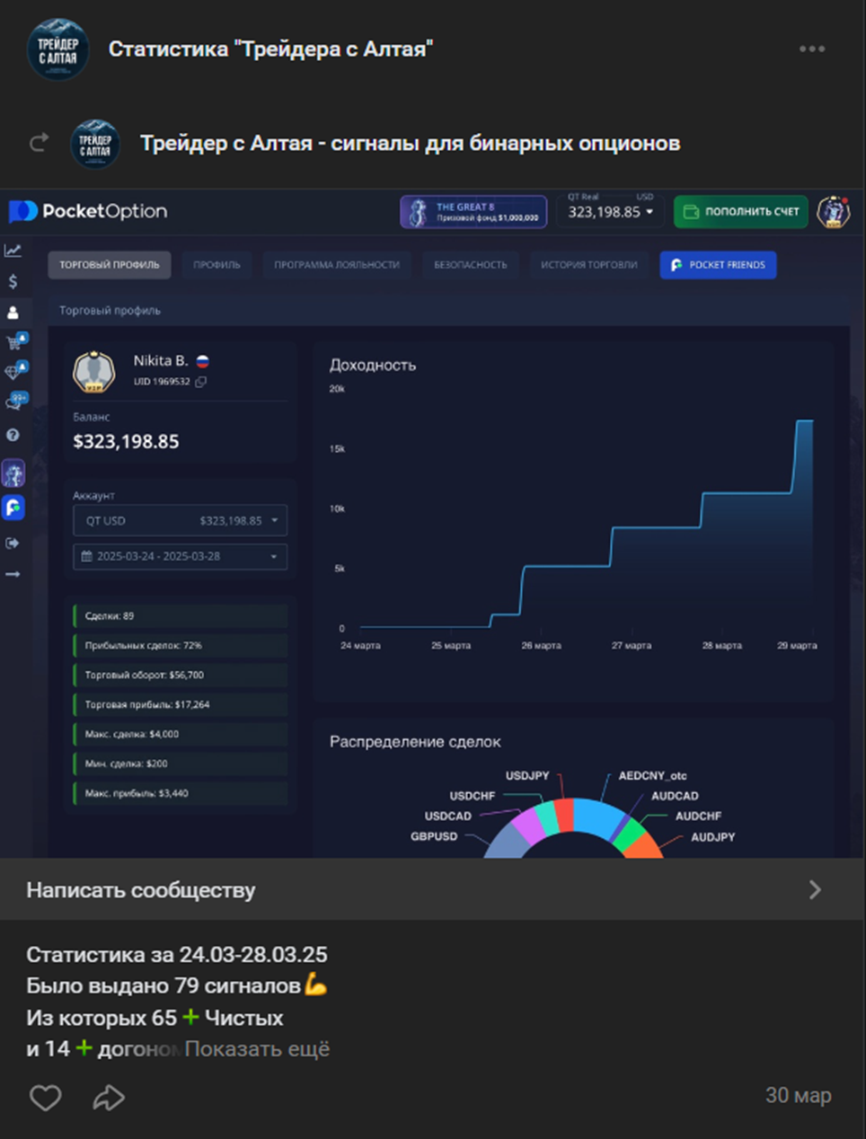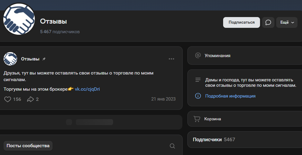 В ВК у трейдера есть паблик на 180 тыс. подписчиков, где размещаются сигналы.