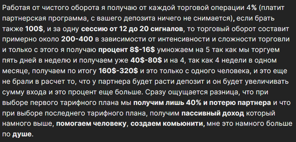- трейдер не делится статистикой, поэтому убедиться в результативности его методов нельзя;