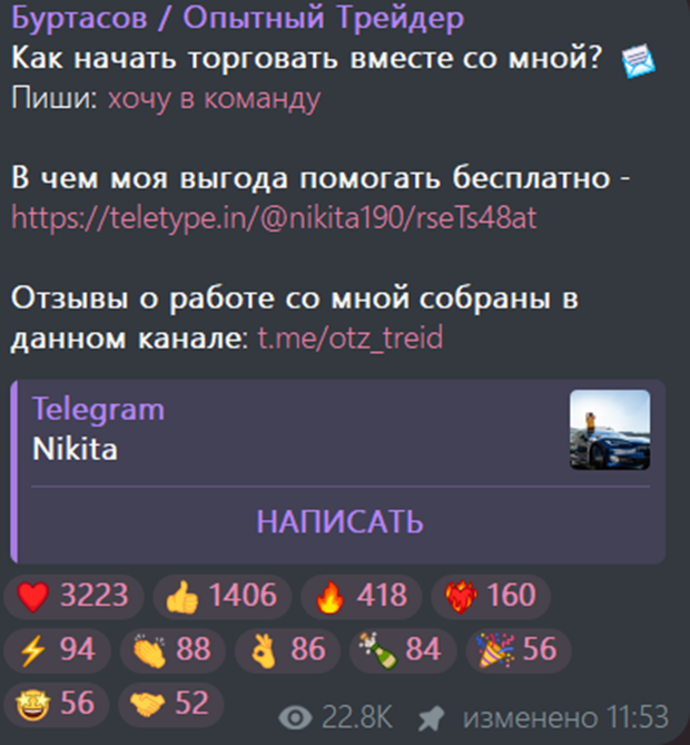 Тематика проектов Никиты Буртасова посвящена трейдингу. Nikita190 создает впечатление успешного и известного эксперта, который точно знает, как делать инвестиции так, чтобы сделки приносили только прибыль. Treider S Altaia предлагает клиентам опираться на его опыт и советы, чтобы зарабатывать так же хорошо, как и он сам. Свои методы заработка инвестор не раскрывает детально, но иногда делится в Телеграмм ссылками на разные проекты, которые потенциально могут помочь заработать.